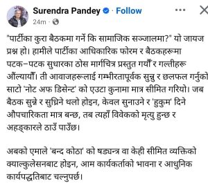 “जब बैठक सुन्ने र सुध्रिने थलो नभई केवल सुनाउने र ‘हुकुम’ दिने औपचारिकतामा सीमित हुन्छ, तब विवेकको मृत्यु हुन्छ र अहंकारले स्थान लिन्छ,” उनले लेखेका छन्।