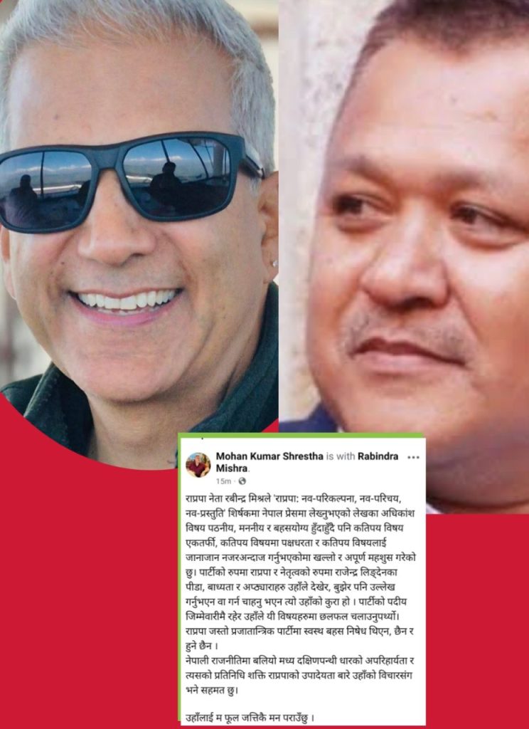 उनले लेखेका छन्, “राप्रपा नेता रवीन्द्र मिश्रले ‘राप्रपा: नव-परिकल्पना, नव-परिचय, नव-प्रस्तुति’ शीर्षकमा नेपाल प्रेसमा लेख्नुभएको लेखका अधिकांश विषय पठनीय, मननीय र बहसयोग्य हुँदाहुँदै पनि कतिपय विषय एकतर्फी, कतिपय विषयमा पक्षधरता र कतिपय विषयलाई जानाजान नजरअन्दाज गर्नुभएकोमा खल्लो र अपूर्ण महसुस गरेको छु।”