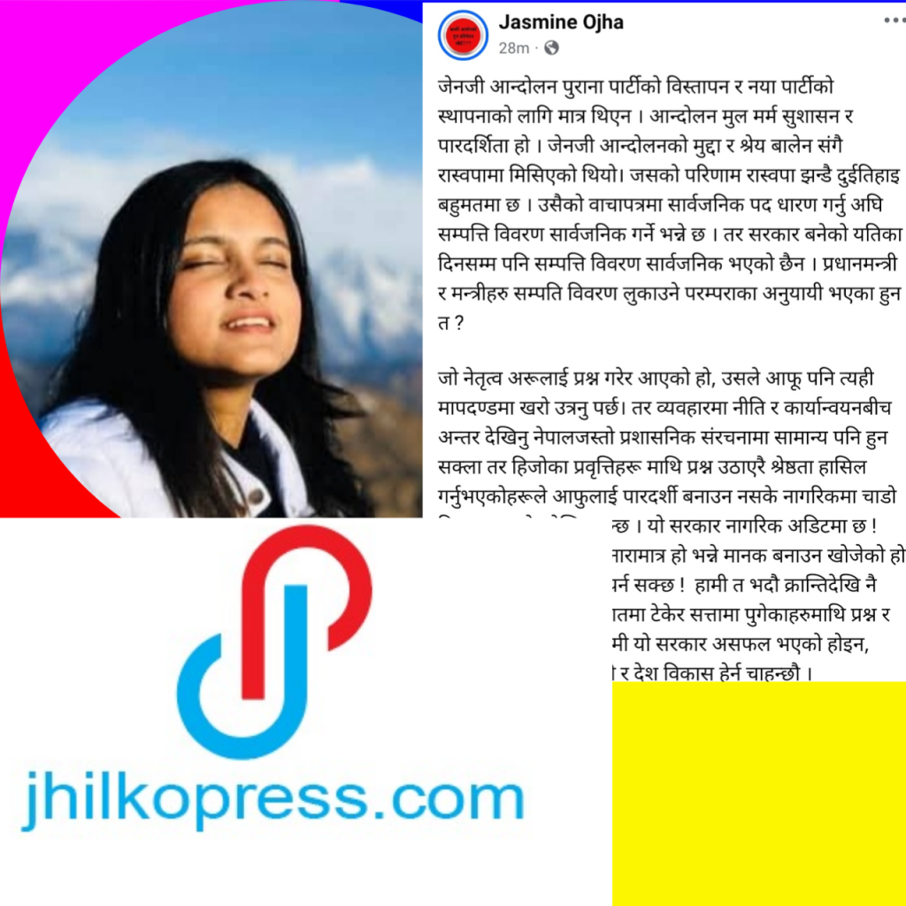 चर्चित जेनजी अभियानता तथा युवा कानुन व्यवसायी जस्मिन ओझाले प्रधानमन्त्रीसहित मन्त्रीहरूले अहिलेसम्म सम्पत्ति विवरण सार्वजनिक नगरेको भन्दै सरकारमाथि कडा प्रश्न उठाएकी छन्।