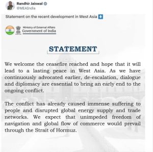 भारतले अमेरिका र इरानबीच भएको अस्थायी युद्धविरामको स्वागत गर्दै यसले पश्चिम एसियामा शान्ति कायम गर्न सहयोग पुग्ने आशा व्यक्त गरेको छ।