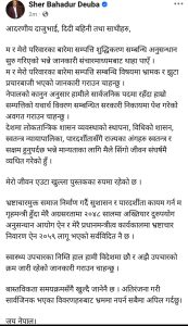 साथै, स्वास्थ्य उपचारका कारण हाल विदेशमा रहेकाले उपचार जारी रहेको जानकारी समेत उनले दिएका छन्। देउवाले सबैमा अपील गर्दै भनेका छन्, “अतिरंजना गरी सार्वजनिक भएका विवरणबाट भ्रममा नपर्नुहोला।”