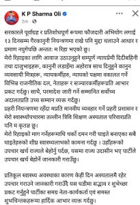 स्वास्थ्य अवस्था अझै प्रतिकूल रहेकाले केही दिन अस्पतालमै बसेर उपचार गराउने जानकारी दिँदै ओलीले यस कठिन घडीमा सद्भाव, समर्थन र शुभेच्छा प्रकट गर्ने पार्टीका नेता–कार्यकर्ता तथा शुभचिन्तकहरूप्रति हार्दिक आभार व्यक्त गरेका छन्।
