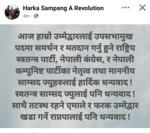 श्रम संस्कृति पार्टीका अध्यक्ष हर्कराज राई साम्पाङले आफ्नो उम्मेदवारलाई उपसभामुख पदमा समर्थन र मतदान गर्ने राजनीतिक दलहरू तथा सांसदहरूलाई धन्यवाद दिएका छन्।