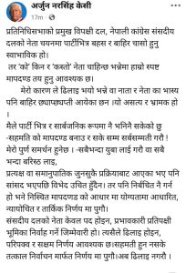 सामाजिक सञ्जालमार्फत धारणा सार्वजनिक गर्दै नेता केसीले संसदीय दलको नेता चयनमा पार्टीभित्र बहस हुनु स्वाभाविक भए पनि “को, किन र कस्तो नेता चाहिन्छ” भन्ने विषयमा स्पष्ट मापदण्ड आवश्यक रहेको उल्लेख गरेका छन्।
