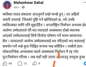 माओवादी आन्दोलनका चर्चित नेता महेश्वर दाहालले प्रतिनिधि सभा निर्वाचनमा मात्रिका यादवको जीतको प्रक्रिया विवादास्पद भएको भन्दै पुनःनिर्वाचनको आवश्यकता औँल्याएका छन्।